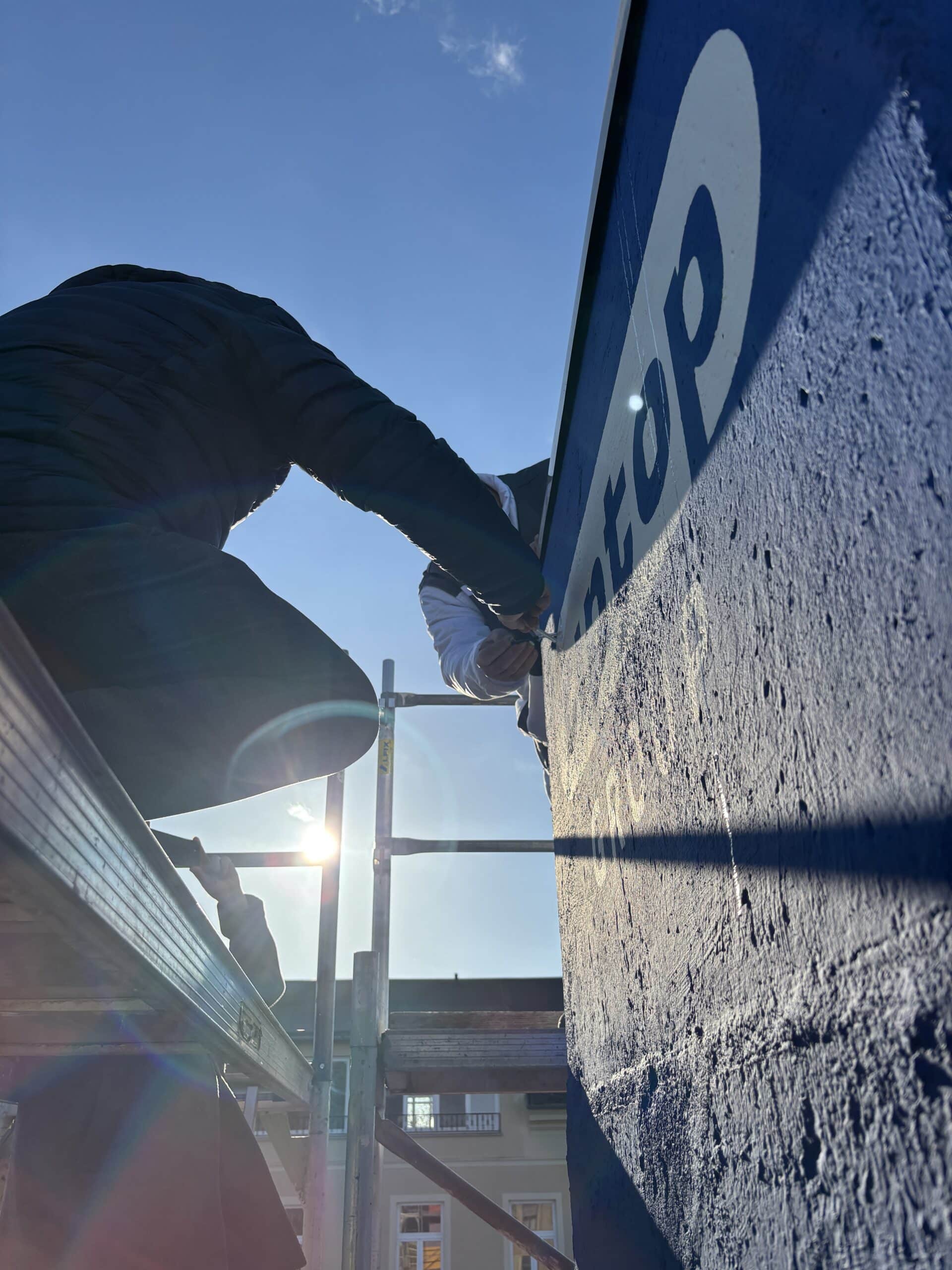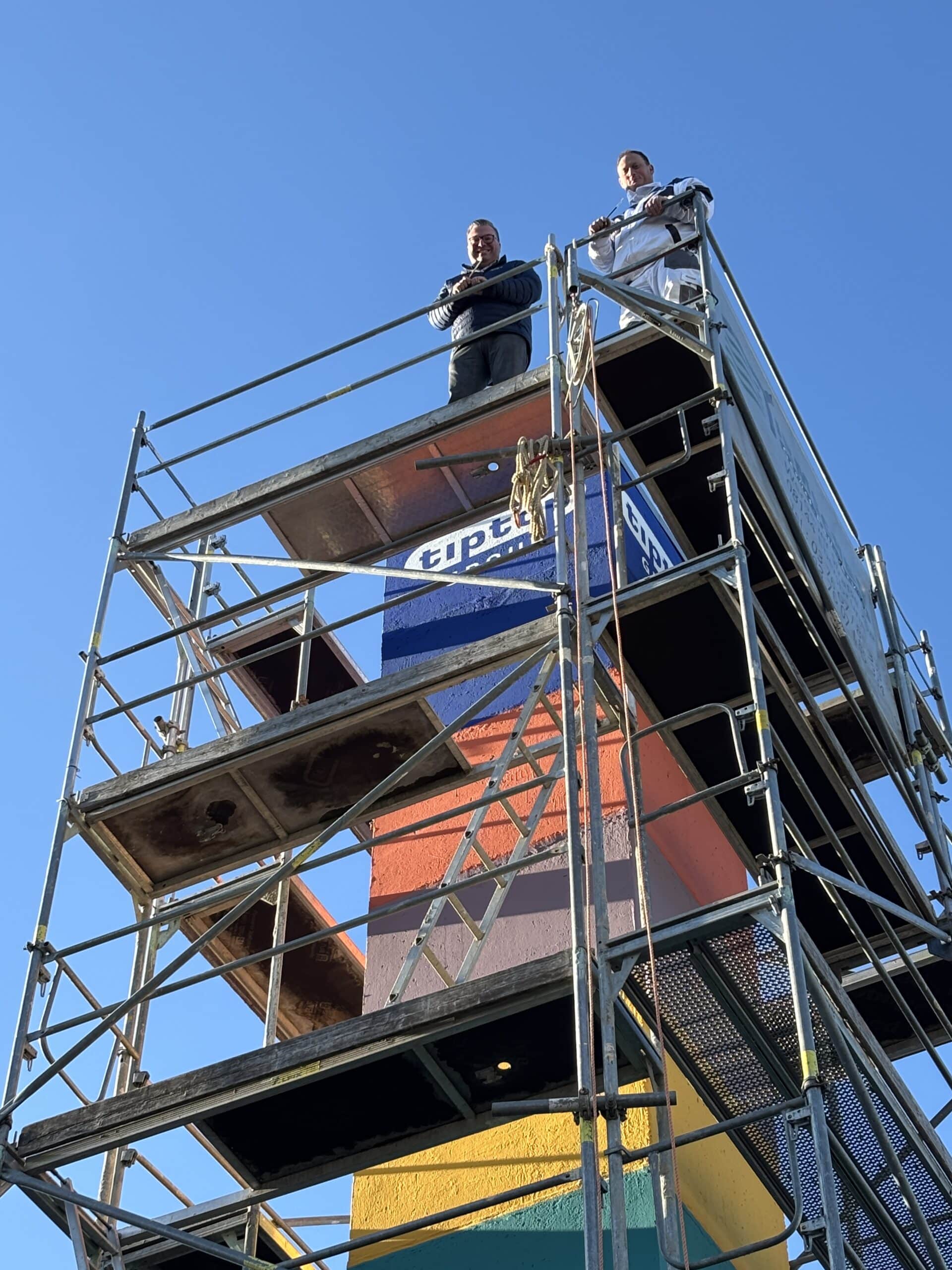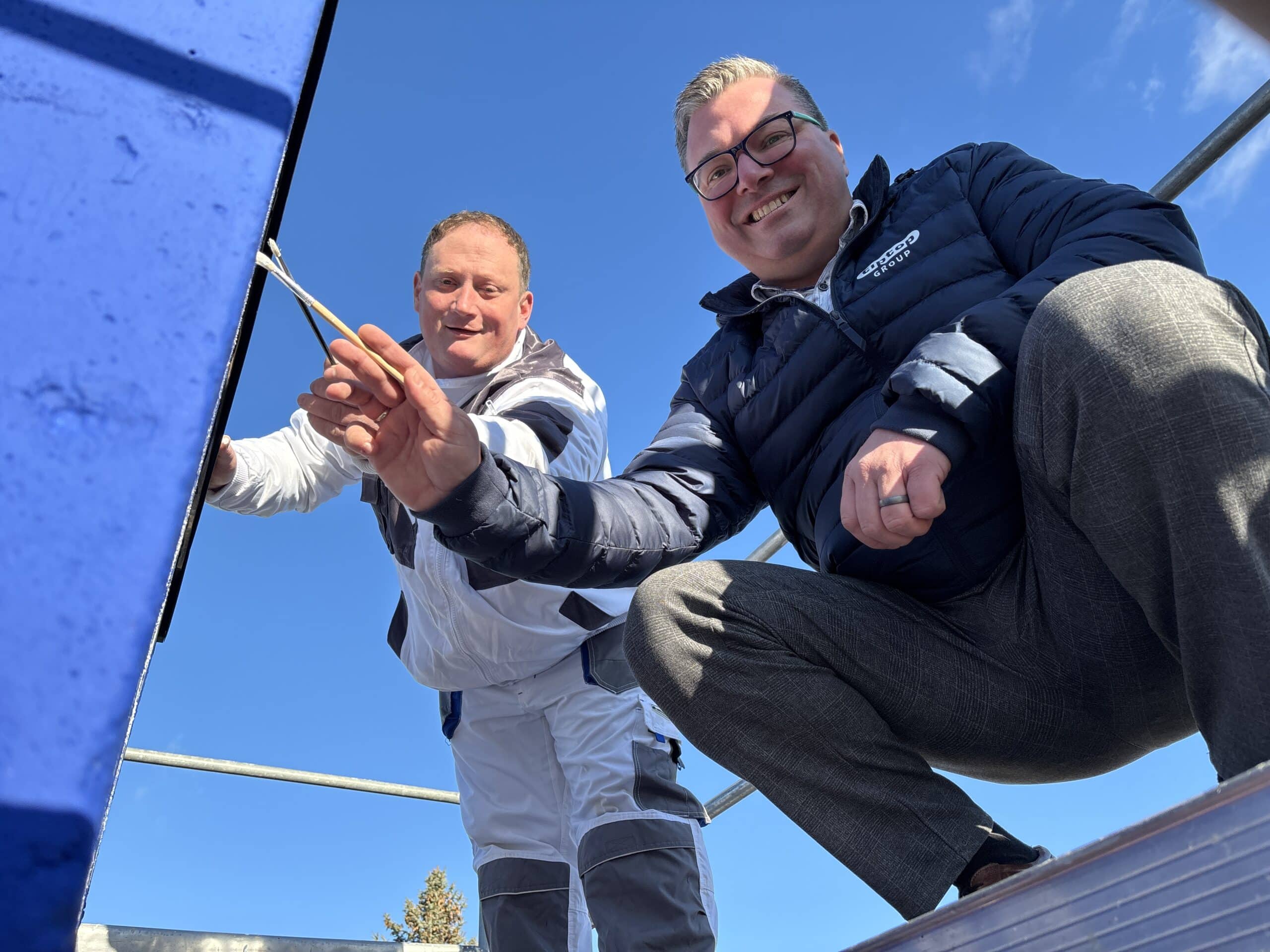 Gesagt – getan. Man suchte in der Region und fand die Steinberger Malerfirma Blank. „Für uns etwas ganz Besonderes, denn einen Maler-Auftrag für einen 14 Meter hohen Turm bekommt man nicht alle Tage. Da wir dieses Jahr unser 100-Jähriges feiern, ist der Turm im wahrsten Sinne des Wortes unser Höhepunkt für 2025“, verrät Malermeister Michael Blank, der die Malerfirma gemeinsam mit seinem Bruder Torsten führt. Betonschäden am Bewehrungsstahl führten dazu, dass vor dem Auftrag der Farben noch kräftig in den Korrosionsschutz investiert werden musste.