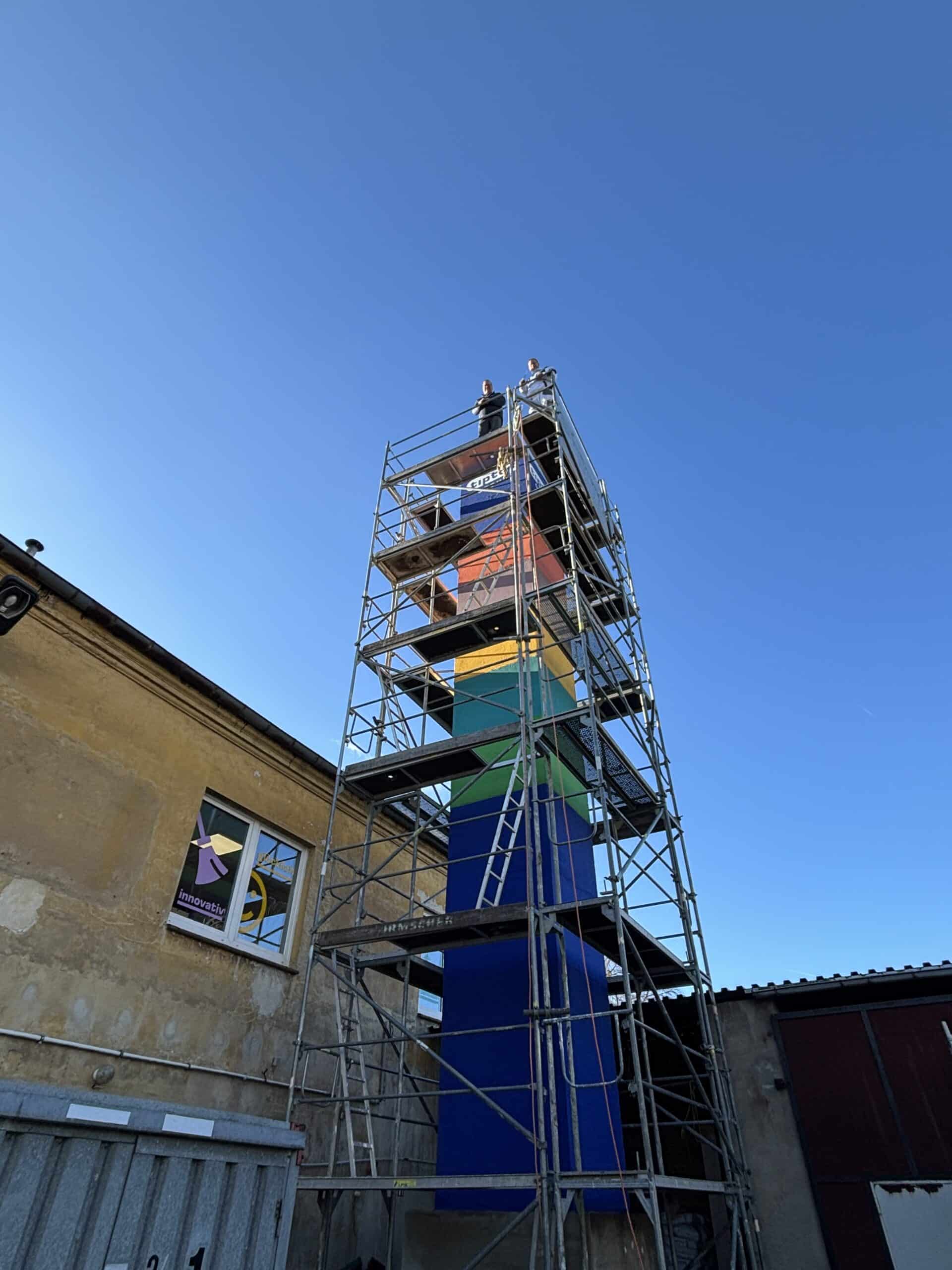 Der neue Standort der tiptop GROUP befindet sich seit kurzem auch im Besitz des Unternehmens. Nachdem der Innenbereich bereits saniert wurde, stand die Planung für den Außenbereich an. „Was machen wir mit dem alten Schornstein, der ohne Nutzung im Weg steht? Eigentlich wollten wir ihn abreißen und die gewonnene Fläche für Parkplätze nutzen“, informiert Niels Pfaff von der tiptop GROUP. „Allerdings musste ich immer wieder an der ‚Bunten Esse‘ vorbeifahren, wenn ich in unser Chemnitzer Büro wollte. Das brachte mich auf den Gedanken, den WIMA-Schornstein zur kleinen Schwester des Chemnitzer Buntstiftes zu machen.“